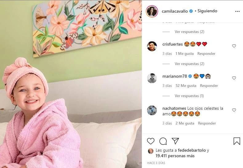 Ahora, que se separó de la modelo santafecina Camila Cavallo (26), intenta también tener buena relación con la joven, madre de su hija más chica, Alma. Camila, asidua usuaria de las redes sociales, compartió una bella foto de Alma, recién salida del baño, lookeada con una bata rosa y una cofia haciendo juego.