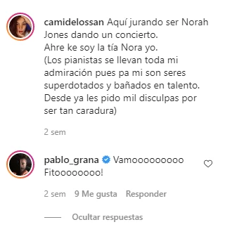 Luego, en un video que subió la joven cantando una canción de Norah Jones, Pablo hace un comentario con humor y amor: "Vamos fitoooo", escribió.