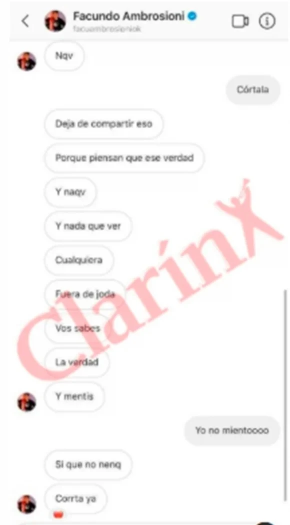 Después de este picante intercambio, se filtró un chat privado entre Facundo y Antonela en el que el futbolista la acusa de estar mintiendo. "Nqv (nada que ver)", le dice él. Y ella le responde: "Cortala".