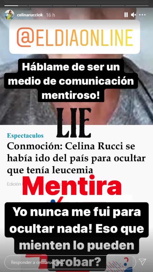 En un principio, Rucci publicó el título de un portal de Gualeguaychú que apuntaba contra ella: “Conmoción: Celina Rucci se había ido del país para ocultar que tiene leucemia”. Y sobre él, molesta, la ex Incorrectas disparó su bronca: “¡Hablame de ser un medio de comunicación mentiroso! Yo nunca me fui para ocultar nada. Eso que mienten, ¿lo pueden probar?”
