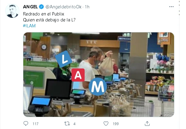 ¡Y ahora Ángel de Brito lo hizo otra vez! El conductor de Los Ángeles de la Mañana (Eltrece) volvió a encontrar infraganti al economista. Esta vez en la fila de uno de los supermercados de la cadena Publix de Miami. “¿Quién está debajo de la L?”, se preguntó de Brito tras publicar la letra tapando a la mujer de barbijo verde que se ve detrás de Redrado.}