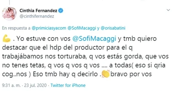 “Yo estuve con vos @sofimacaggi y también quiero destacar que el hdp del productor para el que trabajábamos nos torturaba”, recordó, sobre una experiencia pasada que no fue nada grata para las chicas.