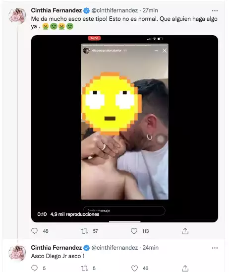 Luego de los comentarios que recibió, Cinthia aclaró que se trataba de Diego Junior: “Este asco de video para los que preguntan en los comentarios es Diego Jr con su hijo. Asco, asco y asco. Que alguien haga algo”, escribió.