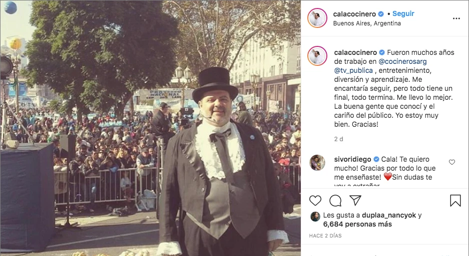 Evidentemente la resolución de su situación en el programa no le gustó para nada y le dolió. Así se deja entrever en otra publicación que realizó Calabrese, ahora en Instagram. "Fueron muchos años de trabajo en Cocineros Argentinos y la Televisión Pública, entretenimiento, diversión y aprendizaje. Me encantaría seguir, pero todo tiene un final, todo termina. Me llevo lo mejor. La buena gente que conocí y el cariño del público. Yo estoy muy bien. Gracias!", manifestó.