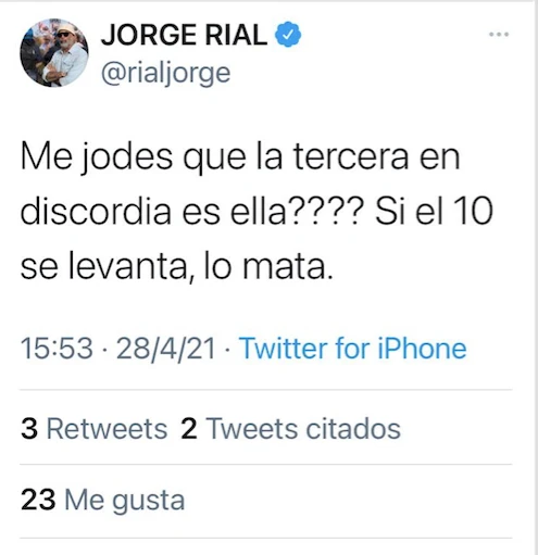 Dentro de ese contexto, quien se involucró en este escándalo fue Jorge Rial, que sin nombrar a Oliva escribió un contundente mensaje en su cuenta de Twitter, en la que deschavó que se trataba de ella: “¿Me jodés que la tercera en discordia es ella? Si el 10 se levanta, lo mata”.