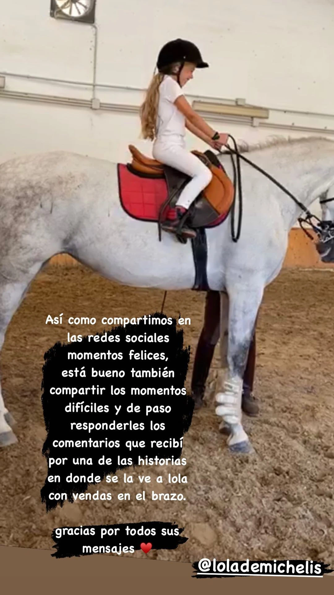 Al terminar su clase el caballo en el que iba Lola comenzó a pelearse con otro: “Lo llevé de una cuerda y cuando se encontró con el otro caballo se empezaron a pelear. Empezó a correr y me empujó. Me caí y me raspé la espalda y la rodilla, aunque esa herida no duele tanto”, relató la pequeña.