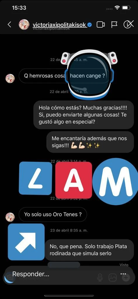 Además, el periodista adjuntó la captura de pantalla de otra de las conversaciones de Vicky con una marca de joyerías: "Que hermosas cosas. Hacen ´cange´", escribió la griega y le respondieron: "Hola, cómo estás? Muchas gracias. Puedo enviarte alguna cosas. Te gustó algo especial?", preguntaron desde la marca.