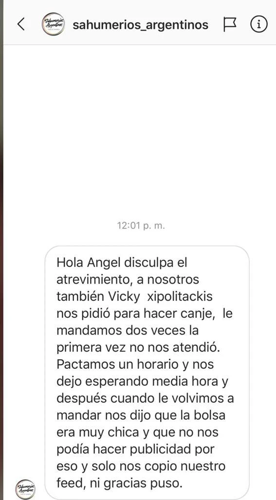 "Hola Ángel, disculpá el atrevimiento. A nosotros también Vicky nos pidió hacer canje, le mandamos dos veces y la primera no nos atendió. Pactamos un horario y nos dejó esperando media hora y después cuando le volvimos a mandar nos dijo que la bolsa era muy chica y no nos podía hacer publicidad por eso y sólo nos copió nuestro feed. Ni gracias puso", le escribieron al periodista desde la cuenta Sahumerios Argentinos.