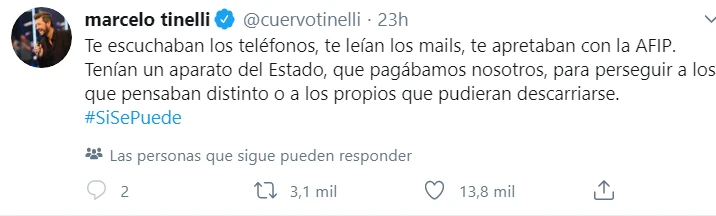 "Te escuchaban los teléfonos, te leían los mails, te apretaban con la AFIP. Tenían un aparato de Estado, que pagamos nosotros para perseguir a los que pensábamos distinto o a los propios que pudieran descartarse", soltó Tinelli.