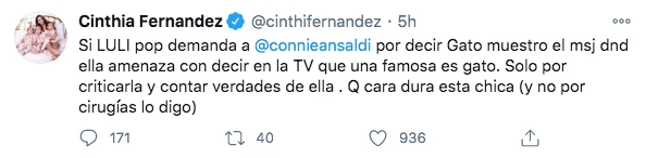 "Si Luli Pop demanda a Connie por decir Gato muestro el mensaje donde ella amenaza con decir en la TV que una famosa es gato. Solo por criticarla y contar verdades de ella. Que caradura esta chica (y no por cirugías lo digo)", escribió la panelista en Twitter.