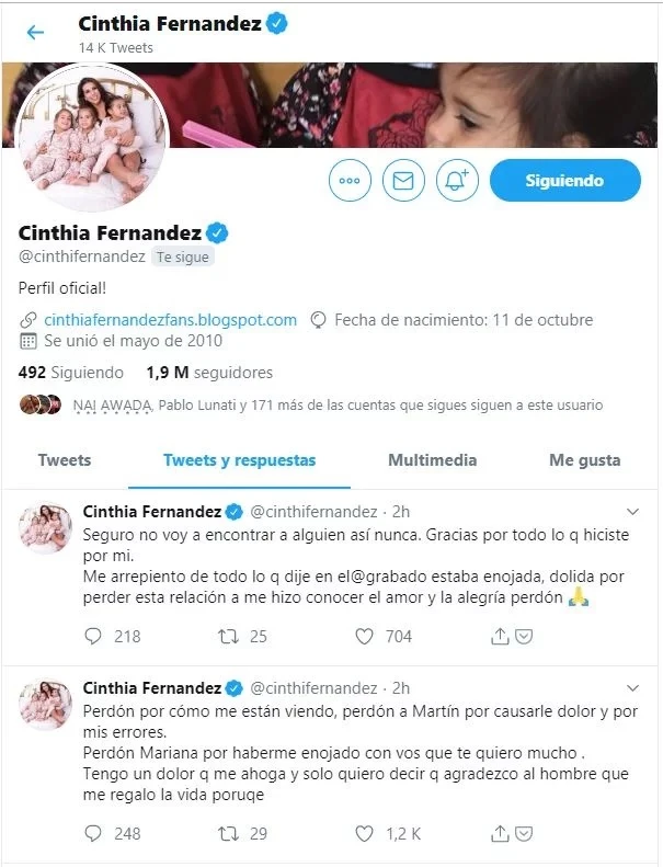 La participante se manifestó su arrepentimiento en la red social por lo sucedido durante la reciente grabación del programa. “Perdón por cómo me están viendo, perdón a Martín por causarle dolor y por mis errores. Perdón Mariana por haberme enojado con vos que te quiero mucho”, escribió Cinthia.