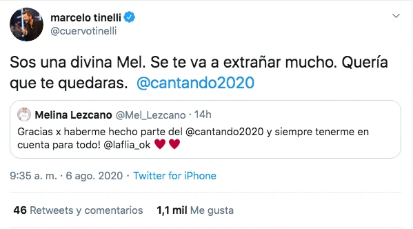 Luego, cuando Melina publicó un mensaje agradeciendo su participación en el certamen, Marcelo le respondió con afecto: “Sos una divina, Mel. Se te va a extrañar mucho. Quería que te quedaras”.