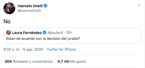 Para demostrar su disgusto, cuando Laurita Fernández preguntó en la red social del pajarito si estaban de acuerdo con la decisión del jurado, Tinelli respondió con un rotundo “no”.