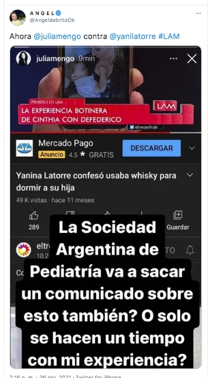 En el medio de un tratamiento de la noticia se conoció que la sociedad argentina de pediatría divulgó un comunicado para contradecir a Mengolini. En diálogo con el siempre opositor al uso de la marihuana Eduardo Feinmann, el presidente de esa entidad sostuvo: “Emitimos un documento con evidencia científica de los daños potenciales sobre bebés con el uso de marihuana durante el embarazo y la lactancia”.