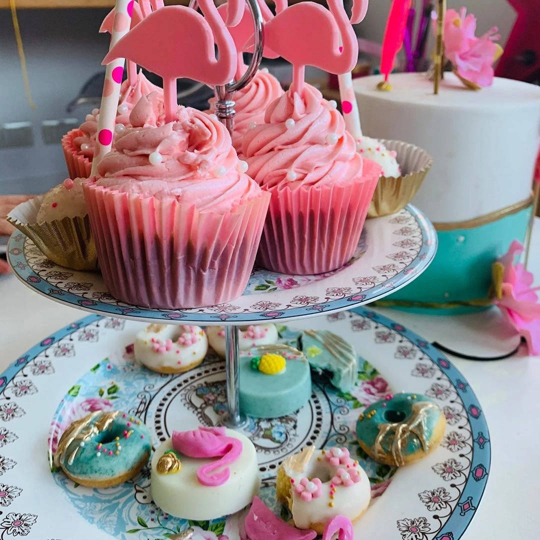 A pesar de que los invitados sólo eran sus papás y su hermano, Esperanza tuvo una mesa dulce con cupcakes, galletas, donas y una super torta de flamencos y flores.