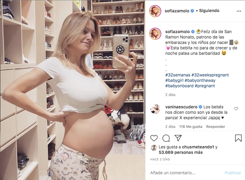 El posteo de Instagram también sirvió para que Zámolo describiera situaciones cotidianas del embarazo, por eso escribió: “Feliz día de San Ramón Nonato, patrono de las embarazadas y los niños por nacer. Esta bebita no para crecer y de noche patea una barbaridad".