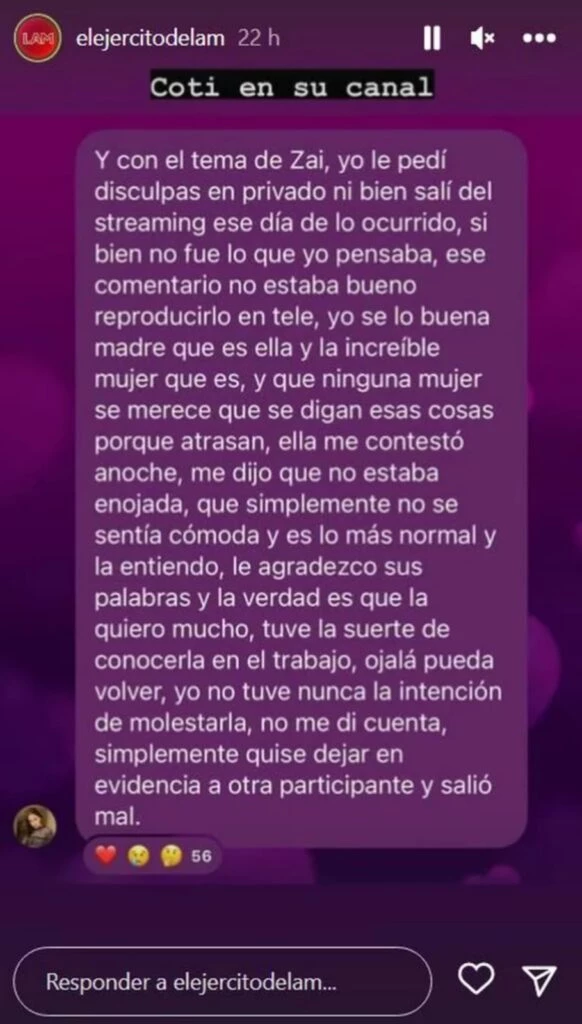 “Con el tema de Zai, yo le pedí disculpas en privado ni bien salí del streaming ese día de lo ocurrido. Si bien no fue lo que yo pensaba, no estaba bueno reproducir ese comentario en televisión”, dijo Coti en su canal de Instagram sabiendo que varios espacios estaban atentos a lo que comentaba.