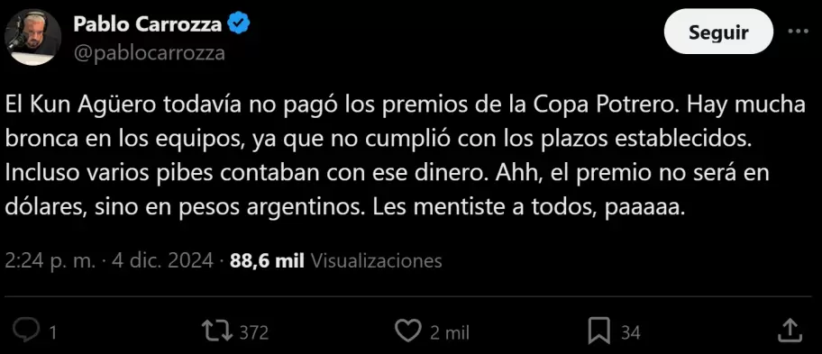 "El Kun Agüero todavía no pagó los premios de la Copa Potrero. Hay mucha bronca en los equipos, ya que no cumplió con los plazos establecidos. Incluso varios pibes contaban con ese dinero. Ah, el premio no será en dólares, sino en pesos argentinos. Les mentiste a todos, pa", escribió Carrozza contra Agüero.