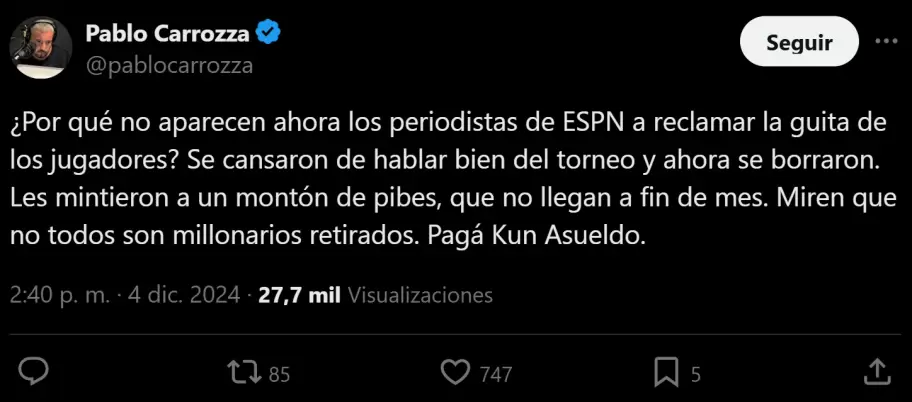 "¿Por qué no aparecen ahora los periodistas de ESPN a reclamar la guita de los jugadores? Se cansaron de hablar bien del torneo y ahora se borraron. Les mintieron a un montón de pibes, que no llegan a fin de mes. Miren que no todos son millonarios retirados. Pagá, Kun Asueldo", cerró.