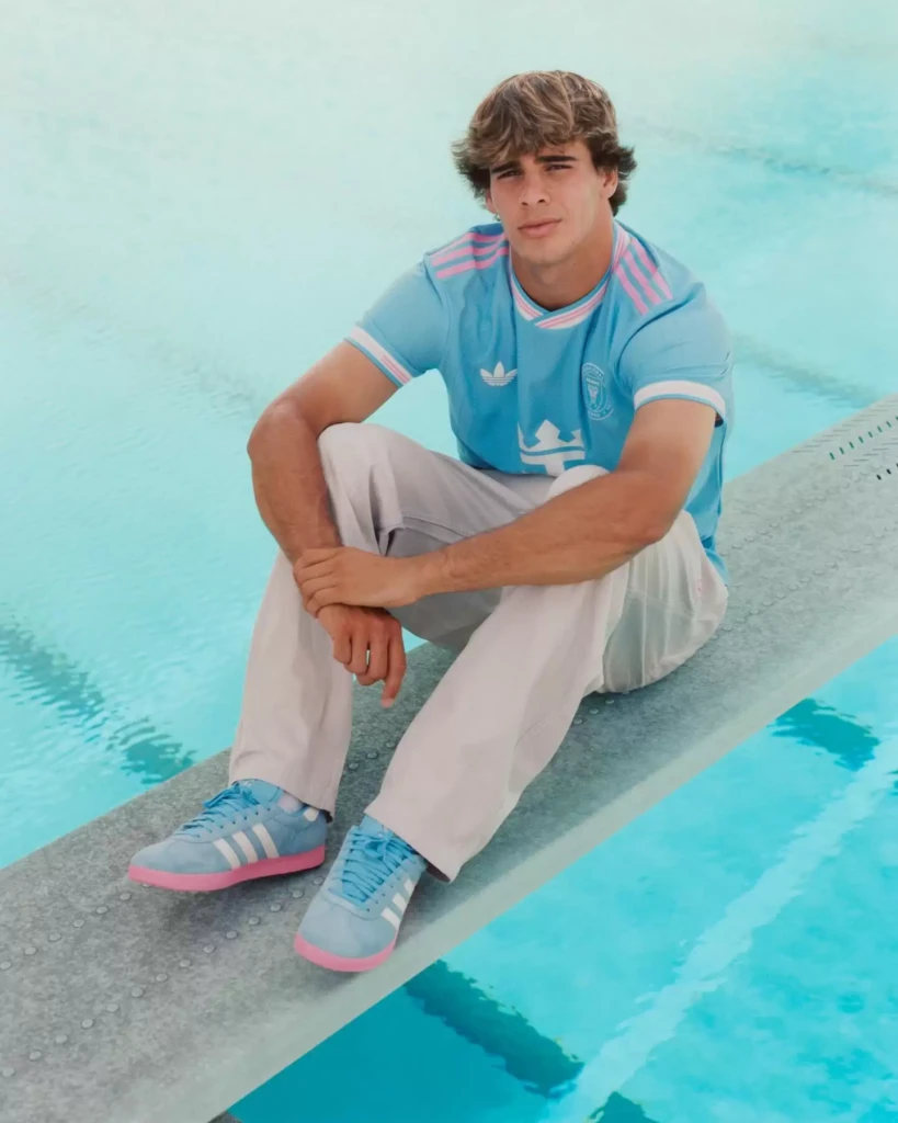 El tono elegido fue “Miami Blue” y marcó un cambio rotundo respecto a versiones anteriores. La nueva colección incluyó chaquetas varsity, remeras con frases del club y hasta las clásicas Gazelle en versión pastel. Todo fue pensado como parte de una cápsula que puede usarse dentro y fuera de la cancha.