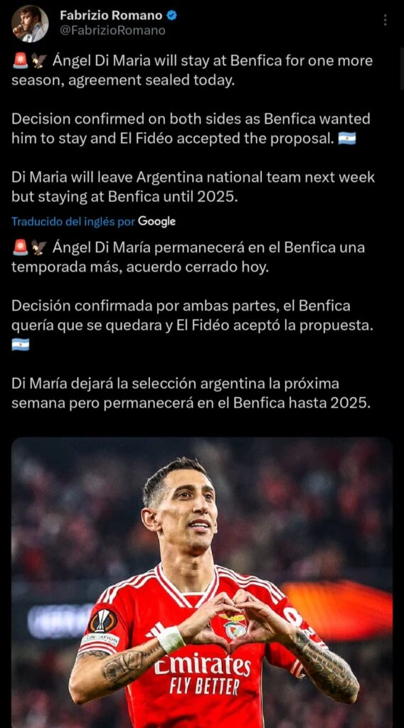 Según lo expresado por el periodista Fabrizio Romano "Ángel Di María permanecerá en el Benfica una temporada más, acuerdo cerrado hoy. Decisión confirmada por ambas partes, el Benfica quería que se quedara y el Fideo aceptó la propuesta. Di María dejará la selección, pero permanecerá en Benfica hasta el 2025".