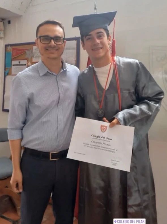 Contento y orgulloso con su logro cumplido, Franco subió una foto en sus redes donde se lo ve con el tradicional atuendo de los egresados, sonriendo junto a una de las autoridades de la escuela pilarnse bilingüe donde lo recibieron a lo grande. “Finalizado sus estudios correspondientes al 6° año del Nivel Secundario Bilingüe”, dice su diploma.