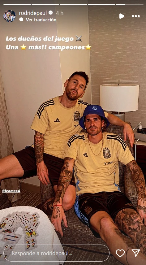 En su cuenta de Instagram, el jugador del Atlético de Madrid publicó una foto de él junto a Leo Messi posando en un sillón. Además, decidió acompañar la imagen con un texto contundente: "Los dueños del juego. Una estrella más!! Campeones".
