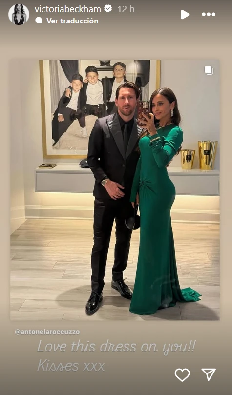 “¡Me encanta cómo te queda este vestido! Besos”, expresó cariñosa Victoria Beckham en sus historias, al compartir en su cuenta el posteo de la rosarina, que en la noche especial del jefe de su marido eligió un diseño de la marca de la inglesa.