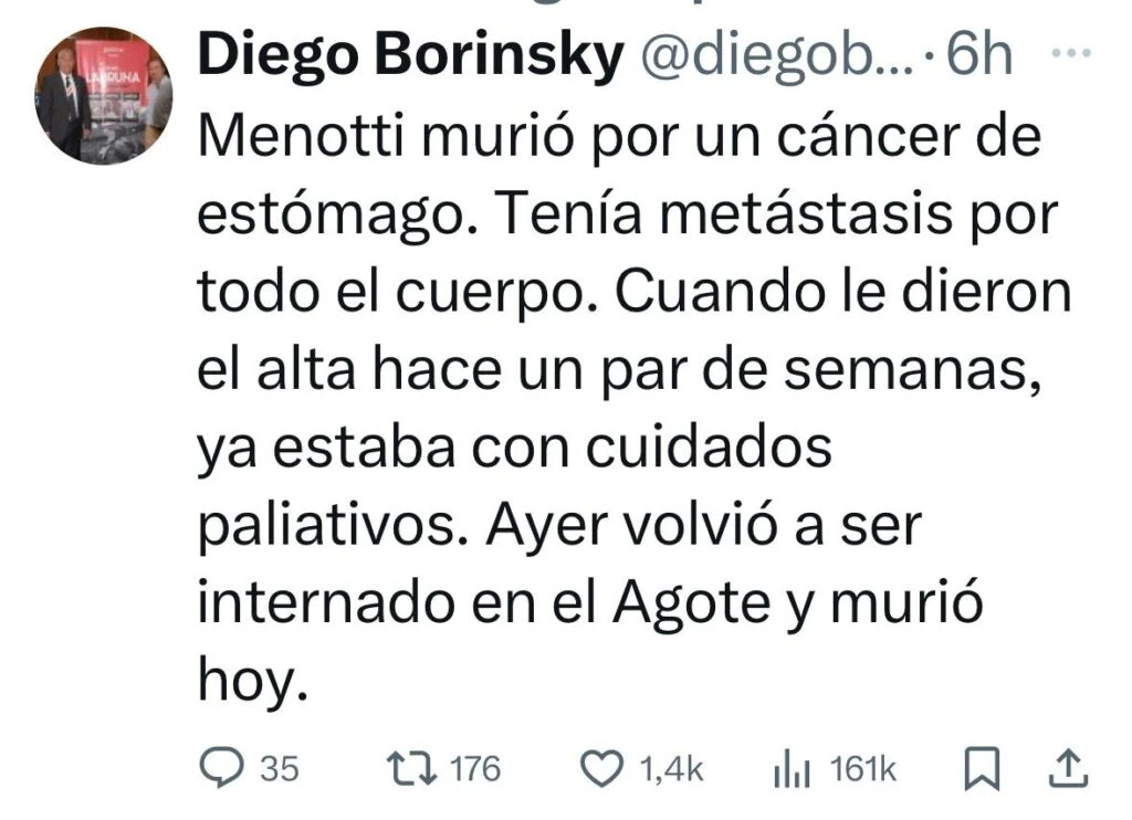 También lo que se contó es que cuando el Flaco recibió el alta médica y se dirigió a pasar tiempo con su familia, ya se encontraba con cuidados paliativos. En estos días la situación desmejoró de manera abrupta y fue internado en el sanatorio Agote, donde finalmente murió.