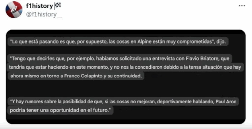 Como si faltaran pruebas de la interna que se viene tejiendo en la escudería de Colapinto, apareció una voz que encendió todas las alarmas posibles. El periodista español Antonio Lobato soltó una frase para resumir que las cosas no vienen nada bien y que hasta se habla de cambios. “Lo que está pasando es que, por supuesto, las cosas en Alpine están muy comprometidas”, comenzó diciendo.