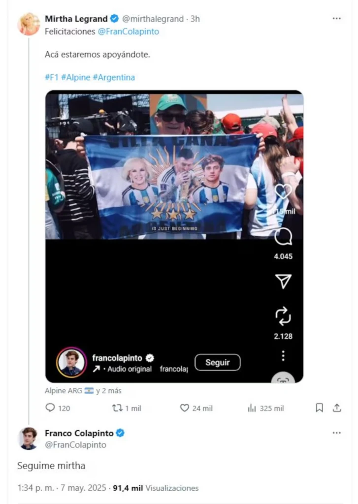 En ese sentido, cientos de famosos le manifestaron su respaldo total a Colapinto. La que apareció en sus redes para mandarle un mensaje y tuvo un divertido ida y vuelta con el piloto fue Mirtha Legrand. La conductora de El Trece le envió un mensaje por su cuenta de X y se hizo viral en cuestión de minutos.