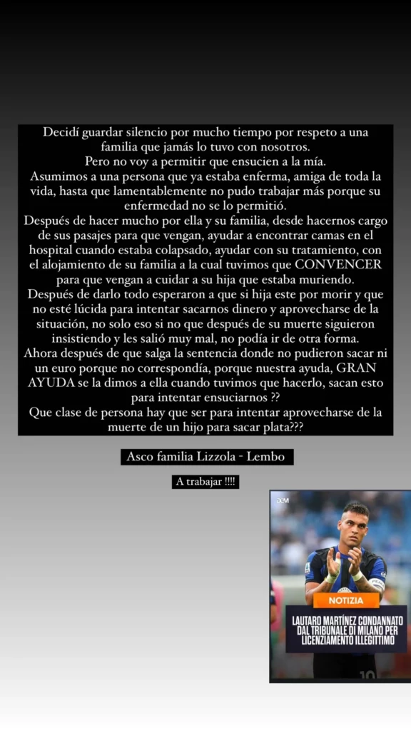 Como Martínez se encuentra en la mira de Italia por esta acusación, su mujer decidió contar su versión: “Decidí guardar silencio por mucho tiempo por respeto a una familia que jamás lo tuvo con nosotros. Pero no voy a permitir que ensucien a la mía. Asumimos a una persona que ya estaba enferma, amiga de toda la vida, hasta que lamentablemente no pudo trabajar más porque su enfermedad no se lo permitió”.
