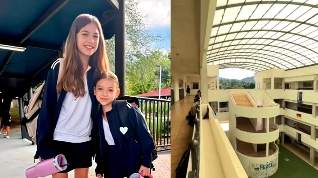 A través de esos posteos de la ex jurado de Los 8 escalones se pudo ver que la escuela tenía un espacio abierto con techo vidriado, banderas de todos los países y varias escaleras. Un enorme complejo educativo rodeado de naturaleza y montañas.