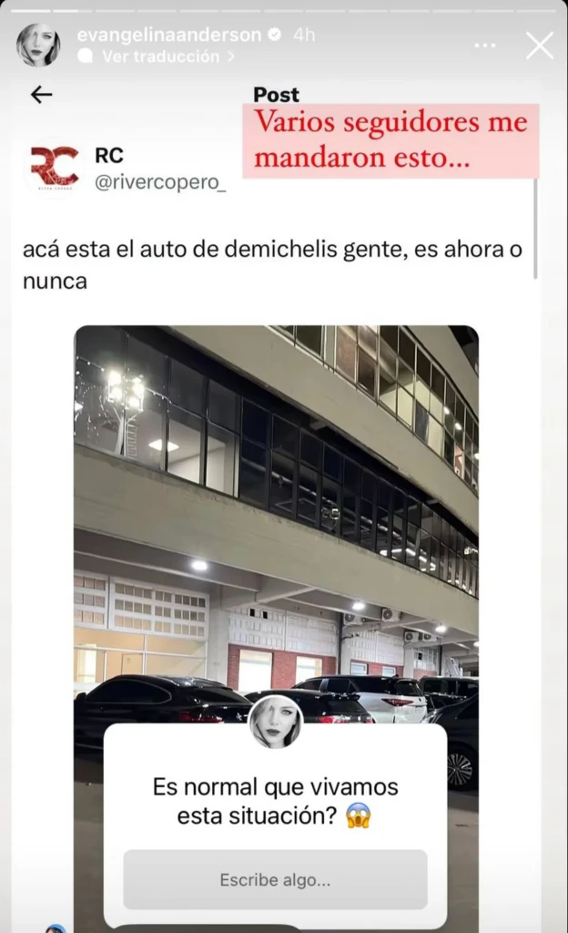 Visualizando este mal momento, Evangelina hizo una consulta sobre si esto debe normalizarse o se puede hacer algo: “Varios seguidores me mandaron esto. ¿Es normal que vivamos esta situación?”. Su historia rápidamente se hizo viral y causó repudio entre los hinchas de River.