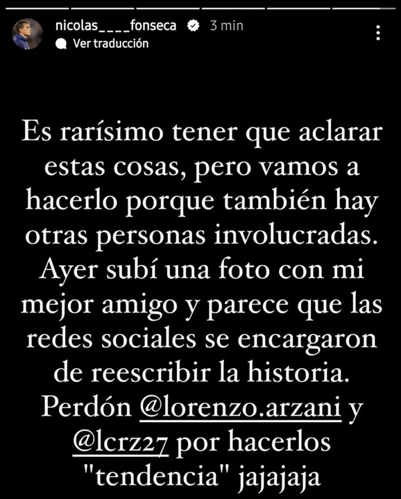 "Es rarísimo tener que aclarar estas cosas, pero vamos a hacerlo porque también hay otras personas involucradas. Ayer subí una foto con mi mejor amigo y parece que las redes sociales se encargaron de reescribir la historia", comenzó escribiendo el joven de River.