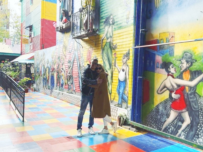 Almirón, que nunca se muestra en redes sociales con su pareja, de origen español, se animó a subir una postal junto a ella, de noche, en uno de los coloridos rincones de, acaso, la calle más turística de la ciudad de Buenos Aires y del barrio de La Boca.
