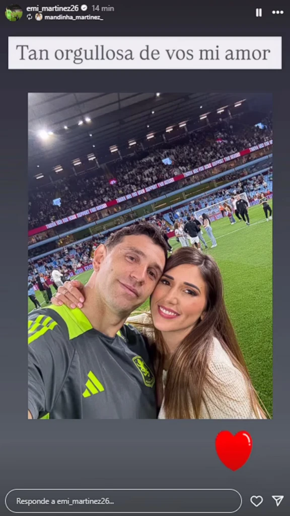 El posteo lo hizo mediante sus historias de Instagram pocas horas después del triunfo del Aston Villa. La fotos en la que ella abrazaba al arquero argentino emocionó a todos y mucho más, la carta que le dedicó a su esposo: "Tan orgullosa de vos, mi amor".