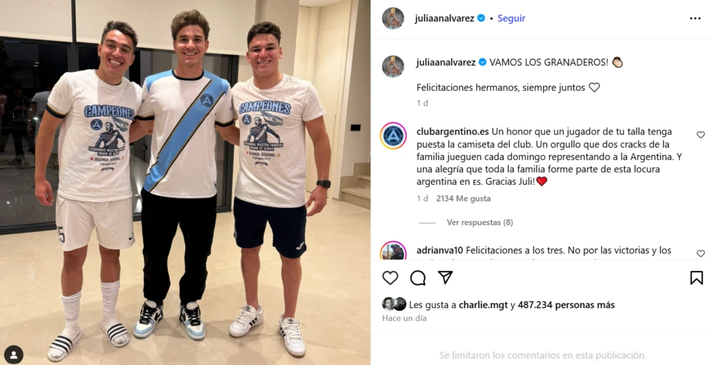 Emocionado con el logro de sus hermanos, Julián celebró el nuevo título a lo grande desde sus redes. En su feed de Instagram, el jugador de la Selección argentina publicó una foto con Rafael y Agustín, luciendo la casaca celeste y blanca.