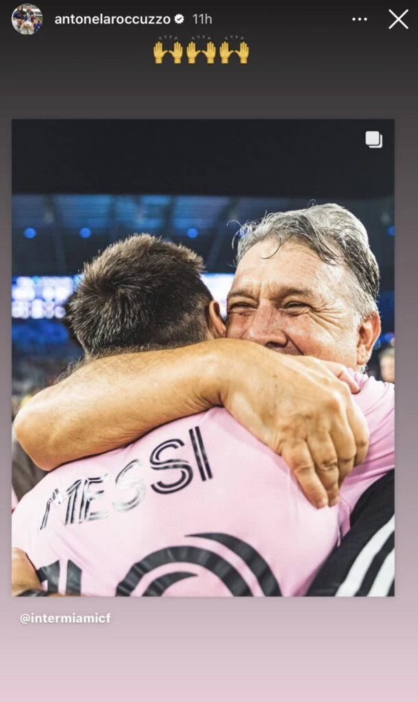 En dicha publicación, que subió la cuenta del Inter Miami y que Roccuzzo replicó, incluso agregando emojis de manitos agradeciendo, bien se aprecia el estrecho abrazo que se dieron La Pulga con el DT del equipo, Gerardo “Tata” Martino, quienes se conocen de antaño y se reencontraron gracias al fútbol.