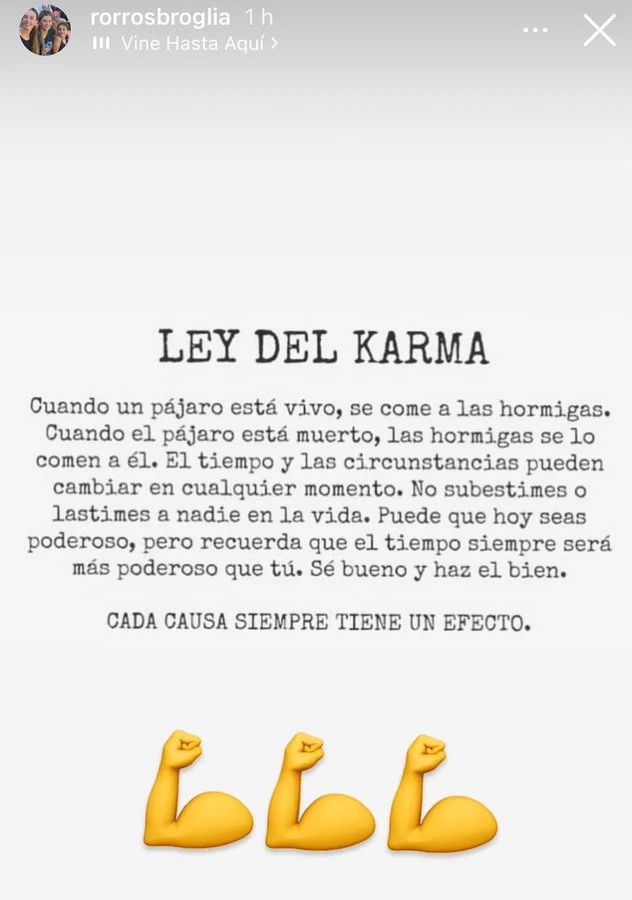 “Cuando un pájaro está vivo, se come a las hormigas. Cuando el pájaro está muerto, las hormigas se lo comen a él. El tiempo y las circunstancias pueden cambiar en cualquier momento”, dice uno de los recientes posteos de Rodrigo. Esto, por caer justamente en este momento deportivo de River, post eliminación y con la imagen de Gallardo un tanto golpeada, fue tomado como un sugerente mensaje hacia el DT.