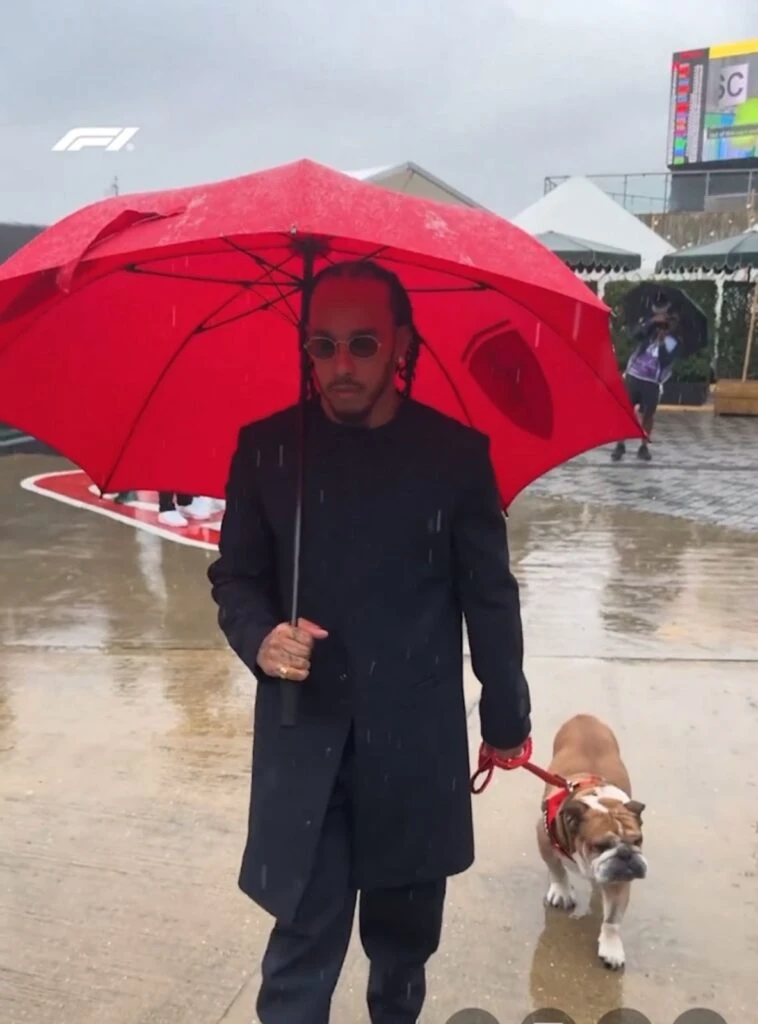 Por la importancia que tiene para Lewis Hamilton y por sobre todo lo que significa para él en un encuentro tan importante como este, la imponente entrada que hizo bajo la lluvia a la jornada en cuestión al predio con su perro, un buldog llamado Roscoe, recorrió el mundo.