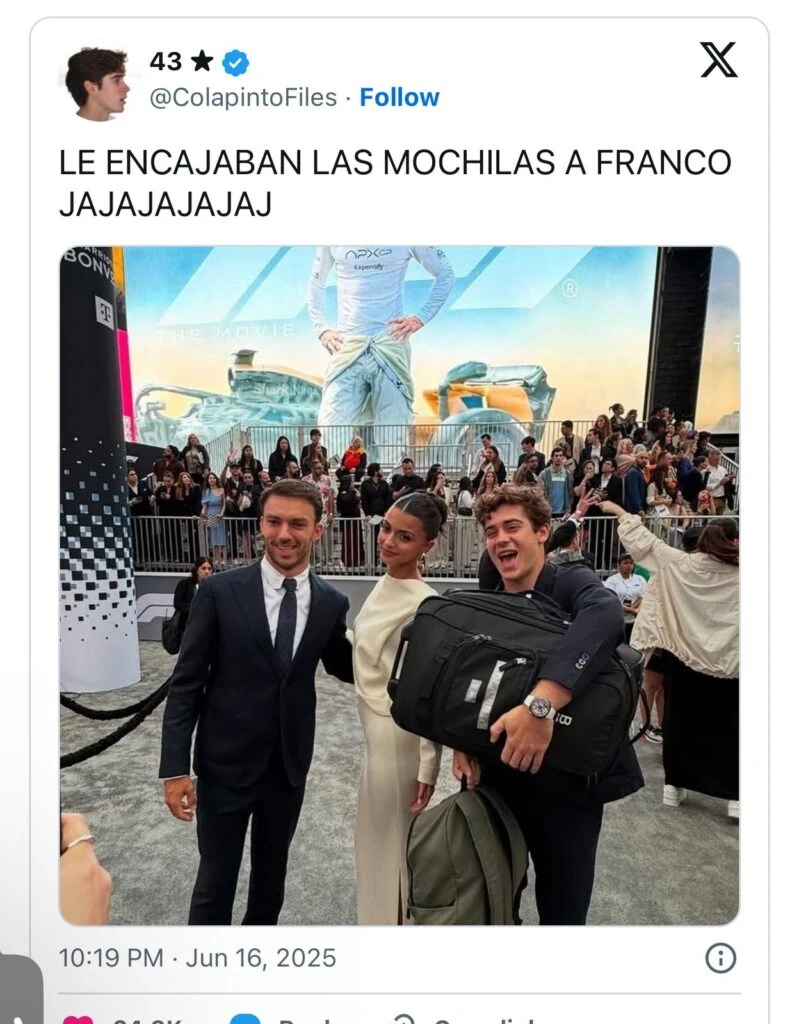 Y fue el hecho de que el corredor argentino haya estado en la Premier en Nueva York lo que hizo que sus fotos en el evento se viralizaran y sea tendencia. Pero el tema de Franco en las redes no quedó ahí. Por el contrario, los distintos momentos que protagonizó en la velada le valió de varios memes y burlas.