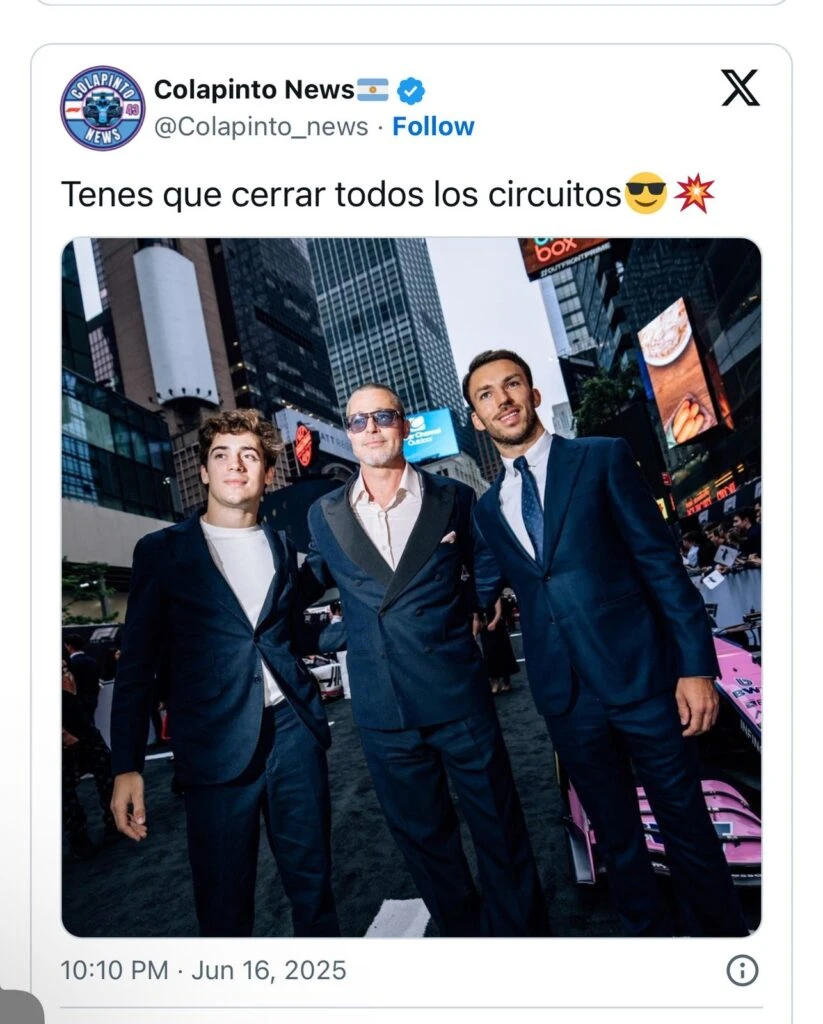Y quien también estuvo en el lanzamiento del film que protagoniza Brad Pitt, acompañado de otros actores como Damson Idris y Kerry Condon,fue nada más y nada menos que, Colapinto quien ingresó por la red carpet al igual que otros corredores como Lewis Hamilton.