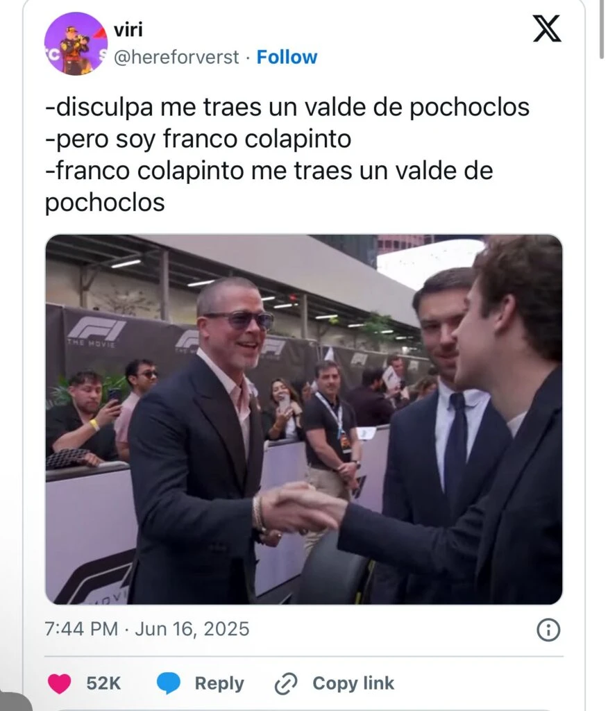 En una de las fotos se lo ve a Colapinto estrechando la mano con Pitt y sobre ella los internautas bromearon con que el ex de Angelina Jolie le estaba pidiendo un balde de pochoclos. En otra el joven corredor posa junto a una pareja sosteniendo una enorme mochila en sus manos. A lo que un usuario de la X tipeó: “Le encajaron la mochila”.