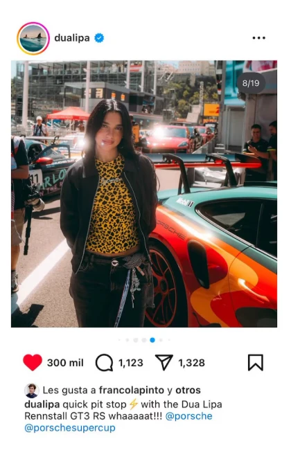 Dua asistió al circuito y luego de la carrera subió un posteo en una colaboración con Porsche. Encantada con la jornada de adrenalina y alta velocidad, la artista escribió: “Parada rápida en boxes con el Dua Lipa Rennstall GT3 RS”. Y Franco no dejó pasar la oportunidad y le dio “Like”.