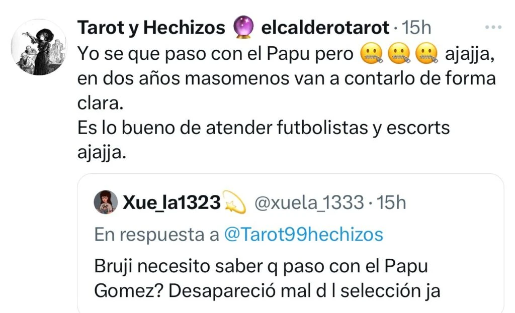 Desde su experiencia en el tema y acostumbrada a vaticinar y acertar sobre futurología, la cuenta Tarot y hechizos habló al respecto cuando un internauta le preguntó: “Bruji, necesito saber qué pasó con el Papu Gómez. Desapareció mal de la selección”.