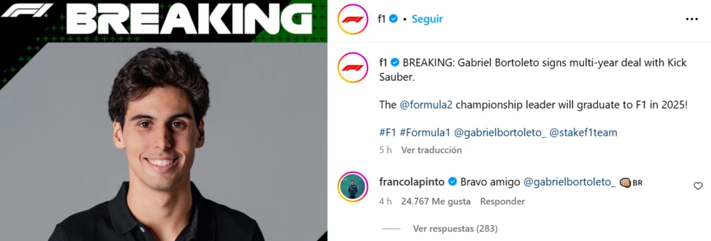 “Bravo, amigo”, escribió Franco junto a un emoji de puño, alentando a su colega de Brasil en esta súper noticia. Cabe destacar que Bortoleto reemplazará a Guanyu Zhou y a Valteri Bottas en Sauber, un cambio clave de cara al futuro que le juega en contra a nuestro piloto.