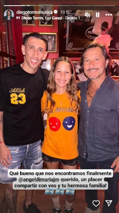 Quien cenó con ellos fue Diego Torres y su hija. El cantante no dudó en compartir en sus historias de Instagram el lindo momento que pasaron juntos. En una de sus historias que subió con Di María, el cantante expresó: "Que bueno que nos encontramos finalmente @angeldimariajm querido, un placer compartir con vos y tu hermosa familia".