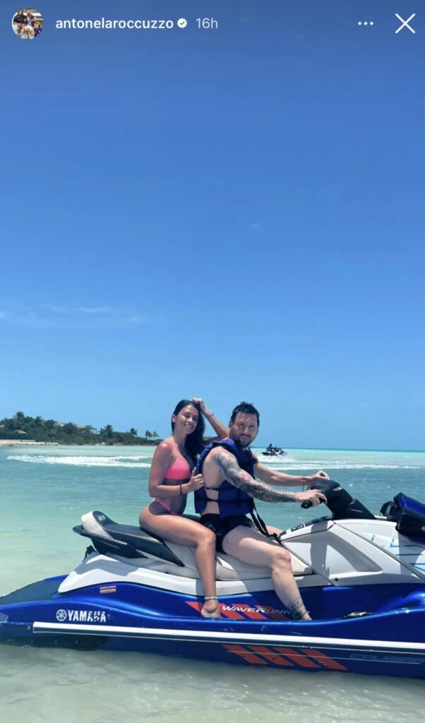 Y fue en la tarde del jueves 6 de julio que, mientras la pareja disfrutaba de andar en moto de agua por las cálidas y transparentes aguas de la isla, se fotografío sobre el vehículo acuático piloteado por Lío mostrando de fondo el paradisíaco paisaje que los rodea en estas vacaciones.
