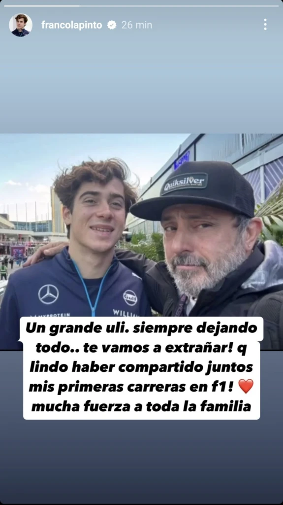 Al ser un habitué en cada una de las carreras, Colapinto le decidió un sentido mensaje en sus redes sociales. Afectado notoriamente por su fallecimiento, que fue confirmado este sábado 29 de marzo, su mensaje no pasó por alto